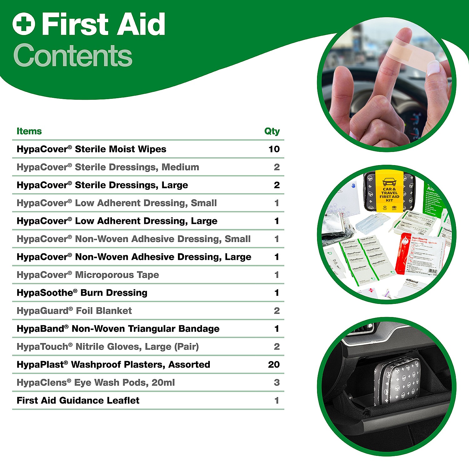 • Ιδανικό για μικροτραυματισμούς εν κίνησει – περιέχει όλα τα απαραίτητα για πρώτες βοήθειες σε ταξίδα ή μεγάλες διαδρομές με αυτοκίνητο